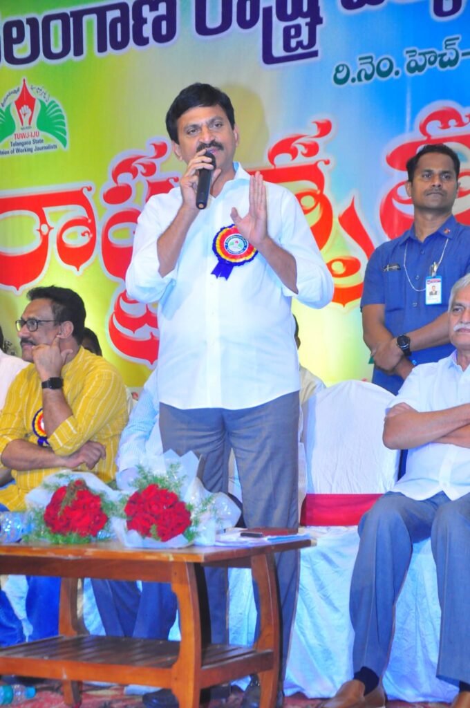 రాష్ట్ర అధ్యక్షులు నగునూరి శేఖర్ అద్యక్షతన జరిగిన ప్రారంభ సభలో ఆయన ముఖ్య అతిథిగా పాల్గొని మాట్లాడుతూ రాష్ట్ర వ్యాప్తంగా జర్నలిస్టుల ఇళ్లస్థలాల కేటాయింపు సమస్యను త్వరలోనే పరిష్కరించేందుకు తాను ఈ సభలకు వచ్చే ముందే ముఖ్యమంత్రితో చర్చించి వచ్చానన్నారు. గత పదేళ్లుగా జర్నలిస్టులు భావ ప్రకటన చేయడానికి కూడా ఎంత ఇబ్బంది పడ్డారో అందరికీ తెలుసునని అన్నారు. ఇందిరమ్మ ప్రభుత్వం జర్నలిస్టుల డిమాండ్లను నూరుశాతం పరిష్కారం చేస్తుందని స్పష్టం చేశారు.